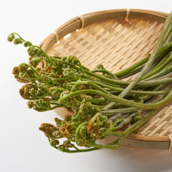 わらびは日本各地で見られる山菜で、春に出る若葉を食べるほか、保存用の乾燥タイプもあります。代謝を助け皮膚や粘膜を守るビタミンB2を多く含み、葉酸や食物繊維も豊富です。
